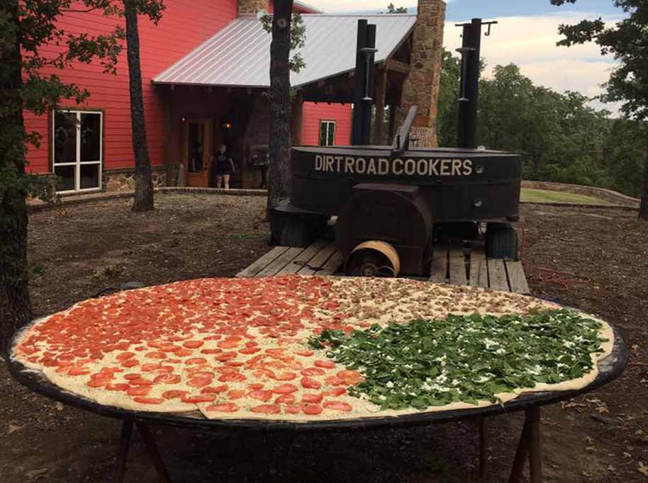 It's football season Texas! Time to book a pizza party! The largest commercially available pizza in the World! Dirt Road Cookers established the World Record Pizza 8-3-2013
